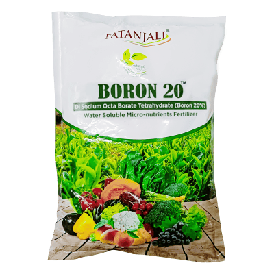 Patanjali Boron-20 is a water-soluble agricultural micronutrient powder with 20% boron that helps prevent boron deficiency in crops, supporting cell wall formation, flowering, fruit setting, root growth and overall plant health.