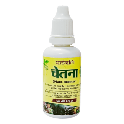 Patanjali Chetna is a plant growth-enhancing biostimulant that improves nutrient uptake, stress tolerance, and overall crop vigor, leading to healthier plants and better yields.