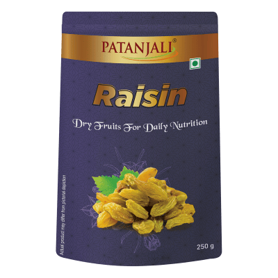 Key Ingredients Kishmish, Key Benefits Raisins helps to keep bones strong . Raisins are also consumed to increase blood in the body., Safety Information Store in a cool & dry place.Use before 6 months from the date of packaging., Technical Information Packed & Marketed By:: Patanjali Foods Ltd. Country of Origin: India Item Weight: 250 g Item Form : Whole Legal Disclaimer : Actual product packaging and materials may contain more and different information than what is shown on our app or website. We recommend that you do not rely solely on the information presented here and that you always read labels, warnings, and directions before using or consuming a product., Additional Information Packed & Marketed By:: Patanjali Foods Ltd. Food Division, Patanjali Food & Herbal Park Vill. Padartha, Laksar Road, Haridwar-249404 Uttarakhand, India
